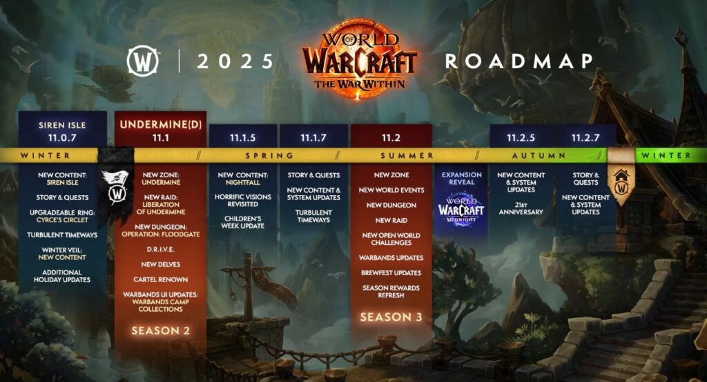 Content updates like Siren Isle and Undermined are part of WoW retail roadmap for 2025. They will bring back Plunderstorm, Turbulent Timeways, and Horrific Visions. Going beyond that, The War Within will give us a full 2 seasons in 2025 with new dungeons and raids.