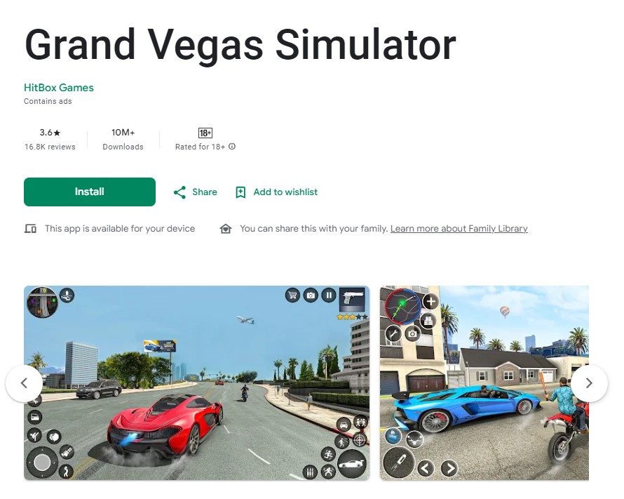 Grand Vegas Simulator is a game that seems to be appropriate for older teenagers and grown-ups (with a rating of 18+ on the Google Play Store). It deals with themes like crime, police chase after criminals, and strategic difficulties. Even though it provides thrilling experiences, this game doesn’t have any explicit content but there are realistic images of police actions as well as criminal activities in virtual Las Vegas.