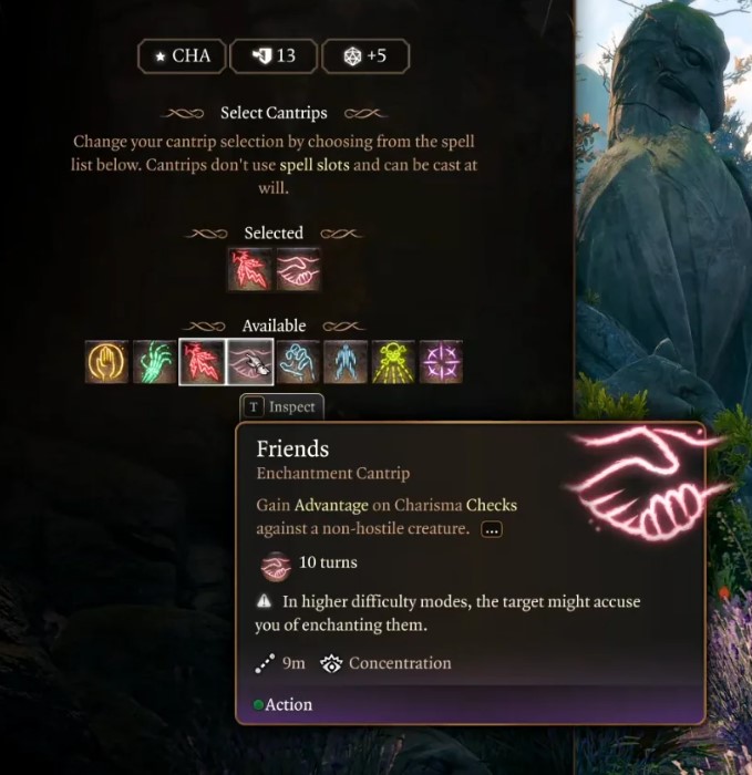 - Playstyle. Concentrate on improving your CHA to 20 at Level 12 for effective spell defense. Fear and Crown of Madness stop crowds, but Spiteful Suffering turns hostile bosses weak. Fight with a longsword and shield with at least 20 points of armor class defense while taking damage with Aura of Hate enhancing summoned defenses;