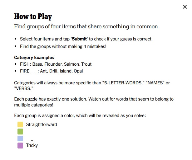 We recommend approaching the solution in NYT Connections:
