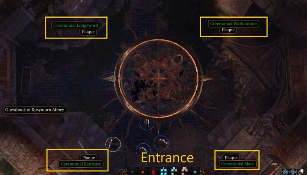 There’s also the Mace in the list, but here’s the twist: it doesn’t have to be ceremonial to help you. A Rusty Mace will work, and one is nearby. To find it, head south of the Enchanted Door where you found the Battleaxe and jump down the broken staircase, then break through a barricade at the coordinates – X:85, Y:32. Lying on the ground there is your makeshift mace for the puzzle. Just like with the Arcane Tower puzzles, everything is not what it seems.
