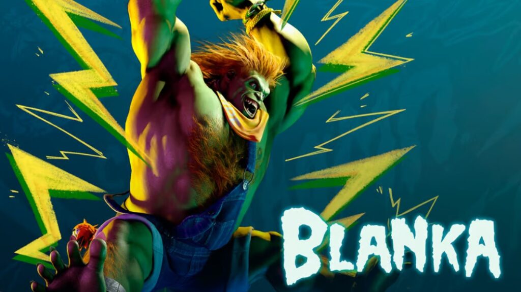 - Blanka in a blue jumpsuit is always ready to surprise with shocking attacks;